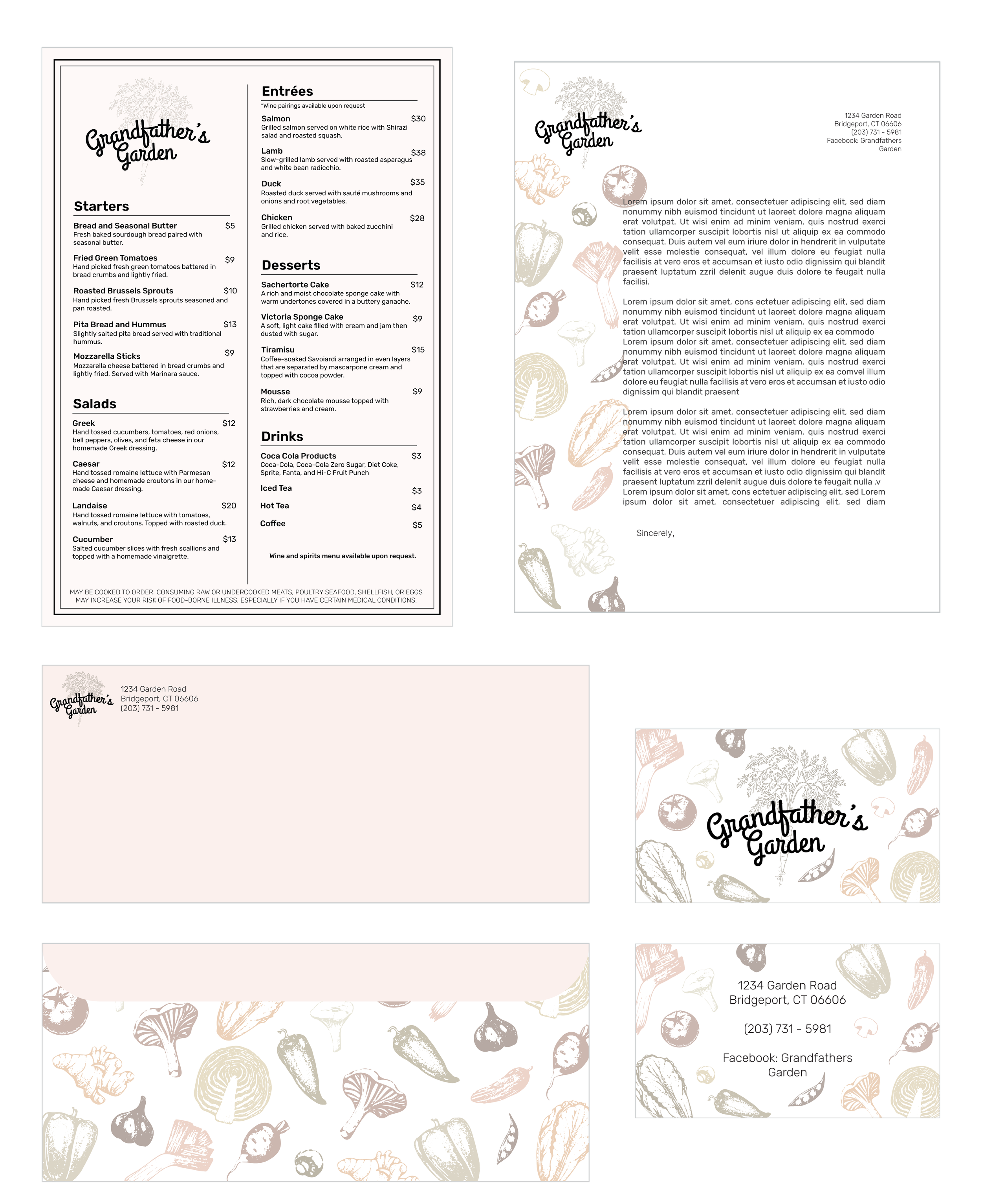 For this student project, I was tasked with designing any kind of restaurant. I wanted to create a concept that felt familiar but elevated. Inspired by the many overdone farm-to-table restaurants across the Midwest, I developed Grandfather’s Garden, a rustic European alternative focused on predesigned meals with minimal American influence. The restaurant would offer a family dining space and a small private bar, aiming for a refined yet approachable atmosphere. One early challenge was creating a logo that incorporated a hand-drawn barn. After several unsuccessful attempts, I pivoted to a simple carrot as the logomark and reinforced it across the brand visuals. This shift ultimately opened more creative opportunities and allowed for a stronger visual system, including vegetable patterns and collateral materials. When designing the style guide, I carried over patterns and colors from the collateral and included stylized food photography to create a cohesive feel.